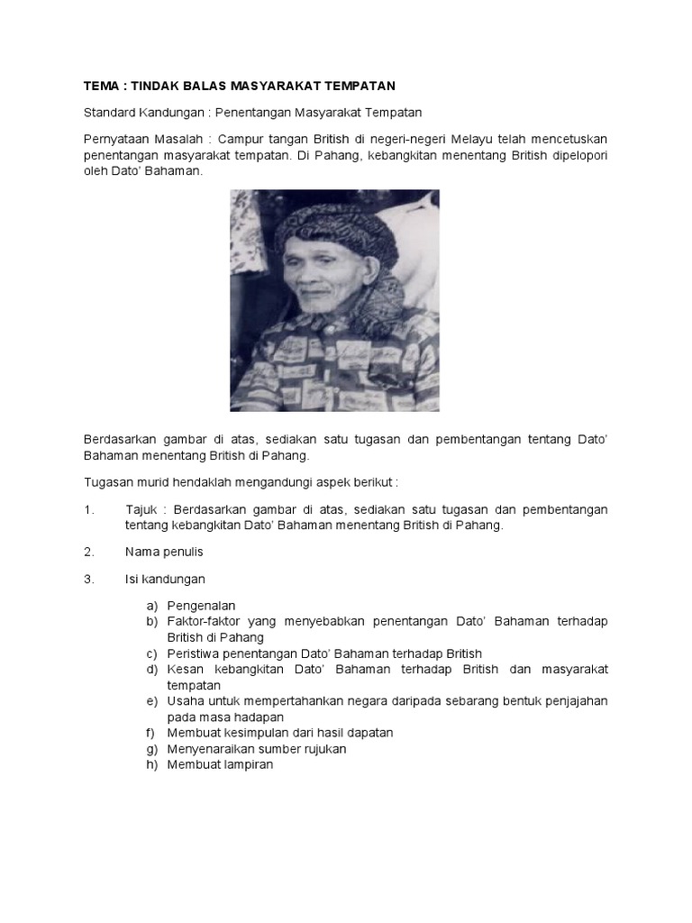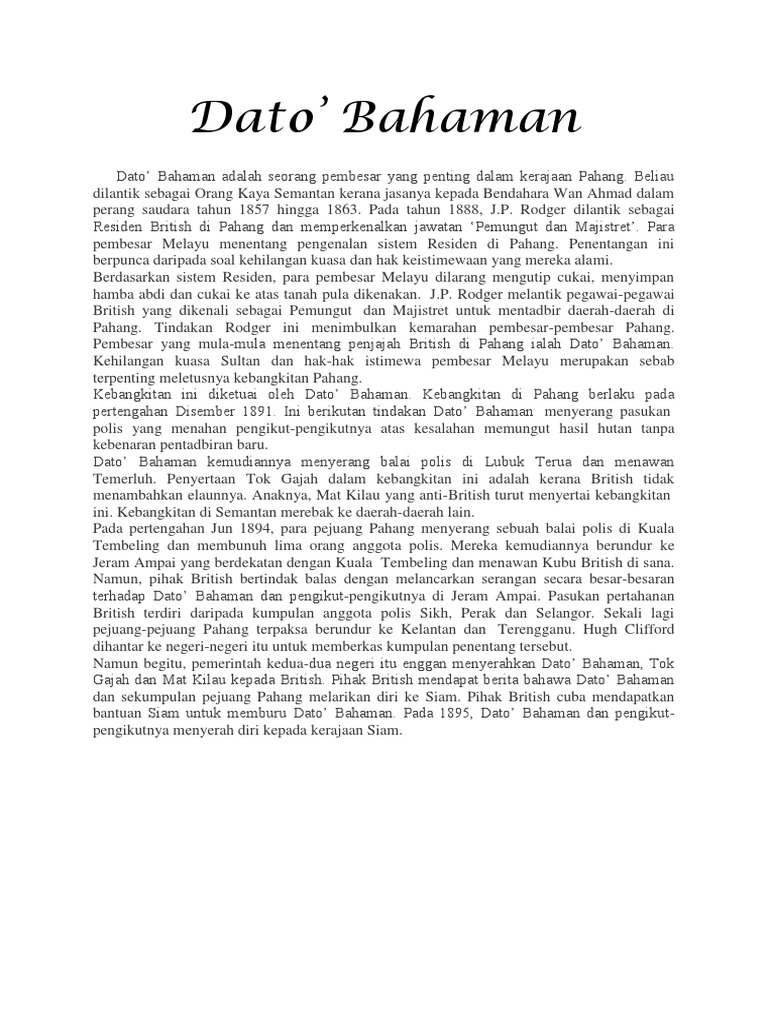 Abdul rahman bin tuanku imam nuh or also known as dato' bahaman was a famous malay warrior in pahang, malaysia during the period of british protectorate. Wise sebagai pegawai majistret pemungut hasil di daerah temerloh, pahang. <b>faktor penentangan dato bahaman a)hilang hak mengutip cukai dato' bahaman menentang tindakan britishmelantik pegawai majistretdan pemungut hasil di daerah temerloh. Kehilangan hak mengutip cukai & dilucut gelaran sebagai pembesar. British memperkenalkan peraturan cukai tanah yang mewajibkan petani membayar cukai tanah pada tahun 1915.